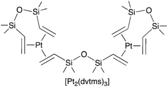Among commercially used catalysts, the most common complexes are based on Pt(0) because of their high activity at relatively low concentrations in the hydrosilylation process. The main commercially available catalysts are the Karstedt’s, Speier’s, Ashby’s, and Lamoreaux catalysts together with a series of non-platinum containing catalysts [22]. The main advantages of the latter systems compared to other platinum compounds are: easy modifiability by various inhibitors and stabilizing ligands and simplicity of synthesis.