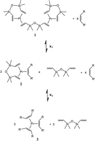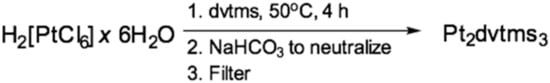 - Lewis, L.N.; Colborn, R.E.; Grade, H.; Sumpter, C.A.; Bryant, G.L.; Scott, R.A. Mechanism of Formation of Platinum(0) Complexes Containing Silicon-Vinyl Ligands. Organometallics 1995, 14, 2202–2213. [Google Scholar] [CrossRef]