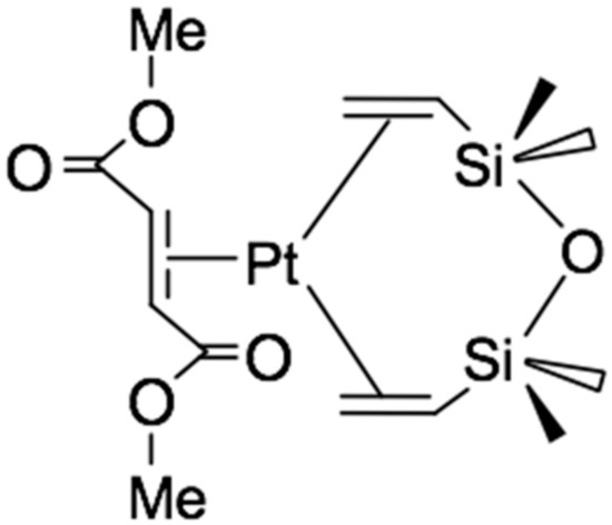 Most often, alkynes and alkenes with electron-withdrawing substituents are used as inhibitors. Their effect is manifested in the formation of relatively inert complexes of platinum (0), preventing the occurrence of hydrosilylation reactions at room temperature during the period of molding or storage of the silicone mixture. The most commonly used inhibitors are maleates and fumarates [26,27]. Thus, in [21], the mechanism of action of dimethyl maleate and dimethyl fumarate as an inhibitor of the reaction of alkenes with silanes was studied. Using 13C NMR spectroscopy it was found that when 4 equivalents of dimethyl fumarate are added to the Karstedt’s catalyst, the complex shown in Figure 7 is formed. The formation of a similar complex is observed in the case of using 4 equivalents of dimethyl maleate.