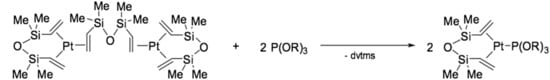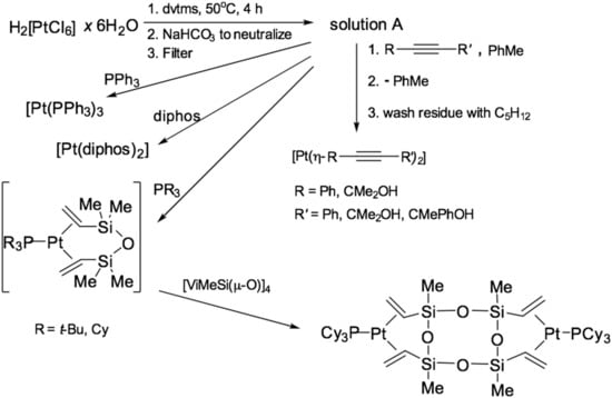 Methods for the preparation of vinyl siloxane complexes of Pt(0) with phosphines were published in [38,39]. These complexes were patented as curing catalysts [40]. Also in these works, the concept of obtaining complexes of platinum(0) was described based on a solution containing vinylsiloxane–platinum (solution A), similar to the Karstedt’s catalyst. Methods for the preparation of complexes of the type [Pt(PR3)3] and [Pt(dvtms)(PR3)] were developed, and it was also found that platinum in this form was suitable for the preparation of its complexes with alkynes, which made it possible to replace expensive reagents of the [Pt(COD)2] and [Pt(nbe)3] (nbe—norbornene) to the equilibrium mixture A. The scheme for the preparation of platinum (0) complexes based on the Karstedt’s catalyst is shown in Figure 8.