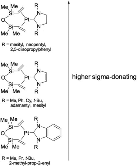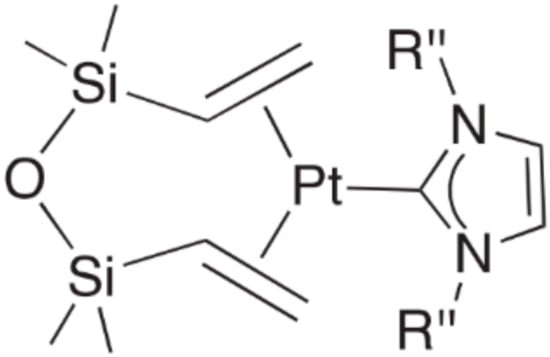 These complexes were thoroughly studied in [47,48,49,50,51]; in the case of N-heterocyclic carbene (NHC) complexes, the Karstedt’s catalyst solution was used as the source of platinum(0). The general structure of the first generation catalyst is shown in Figure 10 (R’’—alkyl- or aryl- substituents).