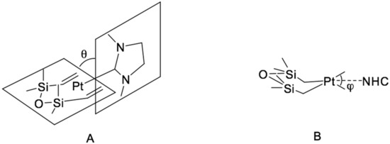 Projections of [(NHC)Pt(dvtms)] structure in terms of the tilt angle (A) and the torsion angle (B).