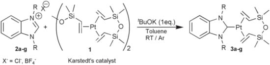 A method for the synthesis of platinum(0) catalysts using benzoimidazole derivatives (Figure 13) is also given in [51]. These complexes are more active because of an increase in the sigma-donating ability of the carbene ligand.