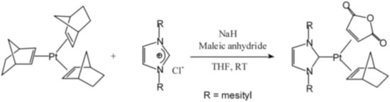 In [53], a series of catalysts were presented, which are complexes of platinum(0) with carbene and two dialkylfumarate molecules. These complexes were obtained using Pt(norbornene)3 as well as imidazole salt and maleic anhydride in tetrahydrofuran, as shown in Figure 14.