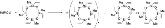 There is a number of works describing the methods of synthesis of Pt(0) complexes with 1,3,5,7-tetramethyl-1,3,5,7-tetravinylcyclotetrasiloxane [56,57]. The use of tetradentate ligand increases stability of platinum complexes by strong chelate effect. A general method of producing this type of catalyst is similar to the preparation of Karstedt’s catalyst; it is based on the reaction of dichlorodiethylene platinum or hexachloroplatinic acid with cyclic methylvinylsiloxane, as it is shown in Figure 15.