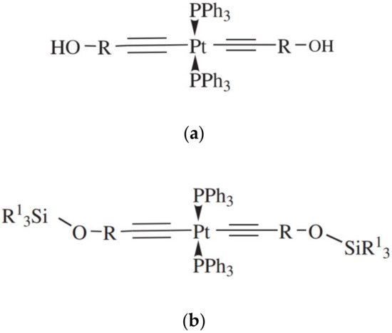 Structure of the catalysts based on Pt complexes with diacetylenyl ligands (a) R—1-cyclohexyl, isopropyl; (b) R1—CH3, CH3CH2, PhCH2CH2).