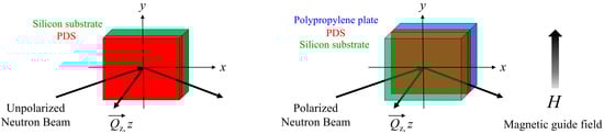 X-ray (XR) and neutron reflectivity (NR) techniques are promising nondestructive methods to evaluate the structure of buried thin-layer samples [10,11]. However, in the XR/NR measurement of a buried thin layer sample, undesired scattering can increase, thus making it difficult to carry out a fine structural analysis of the sample because the X-ray/neutron beam passes through the sample matrix. The use of deuterium (2H) labeling techniques [12,13] is beneficial for controlling the neutron scattering contrast of the organic samples and reducing the proton incoherent scattering because there are significant differences in the incoherent scattering cross-sections of the two isotopes (σincoh (1H) = 79.7 × 10−24 cm2 and σincoh (2H) = 2.0 × 10−24 cm2) [14]. However, it is not suitable for organic polymer samples because it is difficult to obtain a large amount of deuterated polymer materials. Polarized neutron scattering techniques are also important and powerful tools in the study of buried thin layers and organic thin layer samples because these techniques can decrease the spin-incoherent hydrogen scattering background [15,16,17]. These techniques have been used in small-angle neutron scattering experiments; however, few studies have been reported on utilizing the polarization analysis on neutron reflectometry for background subtraction.