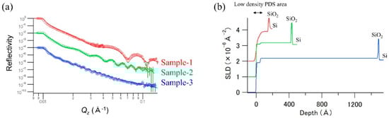 (a) NR profiles of the perhydropolysilazane (PHPS)-derived silica (PDS) thin-layer samples (Samples 1, 2, and 3); the circles represent the experimental data, and solid lines represent the best-fit calculated NR profiles; the profiles are vertically shifted to distinguish between them; (b) neutron SLD profiles of the PDS layer samples calculated from the obtained structural parameters; the profiles are vertically shifted to distinguish between them.