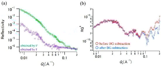 (a) Neutron reflectivity profiles of the polypropylene (PP)/PDS/Si substrate sample obtained by I+ (green) and I− (violet) data; (b) NR profiles before (red) and after (blue) spin-incoherent hydrogen-scattering background (BG) subtraction; the data are plotted as RQz4 versus Qz to enhance the visibility of the Kiessig fringes.