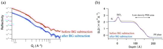 Figure 3a shows the NR profiles obtained from the I+ and I− data. It is clear that the PP/PDS/Si substrate sample exhibited large incoherent scattering, and the incoherent scattering intensity became even larger compared with the coherent scattering intensities in the Qz > 0.14 Å−1 region. H atoms of the polypropylene molecules would mainly contribute to the incoherent scattering because the PDS and Si substrate contained only a small amount of hydrogen. Therefore, neutron polarization analysis was carried out to eliminate the spin-incoherent scattering components experimentally to avoid smearing out the characteristic oscillations emanating from the thin layer structure. Figure 3b shows the NR profiles before and after the “spin-incoherent hydrogen-scattering background (BG) subtraction” using Equations (1) and (2). The amplitude of Kiessig fringes in the higher Qz region increased after subtracting the contribution of the spin-incoherent hydrogen-scattering background. Thus, it was confirmed that the coherent and spin-incoherent scattering components were clearly separated through the polarization analysis. We performed a fitting analysis for the data in Figure 4a using the Motofit program. There were no significant differences in thickness and roughness obtained from the fitting analysis of the before and after background subtraction data. However, the obtained SLD values of the PDS (low-density) and PDS layer in the “after background subtraction data” (0.73 and 1.93 × 10−6 Å−2) were lower than those in the “before background subtraction data” (0.83 and 2.10 × 10−6 Å−2) (see Table S2 in Supplementary Material). This indicates that the background subtraction affected not only the shape of the NR profiles but also the results of the fitting analysis. As the Kiessig fringe amplitude can be related to the neutron contrast between the substrate and the sample layer, the correct SLD values could be obtained by the background subtraction. Since the slope of the NR profile is related to the roughness of the sample surface and/or interface, the roughness values were slightly changed by the background subtraction. In addition, the low SLD value of the PDS (low-density) layer compared with that of Sample-1 indicates that the bulk PP plate penetrated into the PDS (low-density) layer owing to the sandwiching of the silicon-substrate and PP. Assuming that the PP plate simply penetrated into the PDS layer, from an SLD value of 0.73 × 10−6 Å−2, the mixing ratio of SiO2 to PP molecules in the low-density PDS area was estimated to be 1:1. In addition, although the total layer thickness (the low-density PDS + high-density PDS) of the PP/PDS/Si-substrate sample became slightly thinner than that of Sample-1, the PP plate and Si substrate were separated by the high-density PDS layer even after the sandwiching process. It can be concluded that the fine nanostructure of the PDS thin layer in the deep-buried condition could be elucidated by nondestructive methods of polarized NR analysis, and the results suggest that the synthesized PDS with a uniform layer of approximately 11 nm was sufficient to separate the upper layer and the underlying substrate.