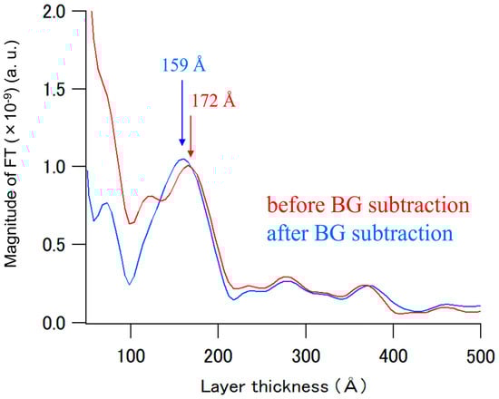 Figure 5 shows the FT of the NR data shown in Figure 3b. There are distinguishable peaks in the FT spectra at 172 Å (before the BG subtraction) and 159 Å (after the BG subtraction), respectively. It is important to note that in this case, the period of Kiessig fringes strongly depends on the total thickness of the sample. According to the problem, the FT cannot discriminate between these layers (low-density PDS, high-density PDS, and SiO2). As the total thickness obtained by the fitting analysis was 157 Å, the obtained peak position in the FT spectrum of the “before BG subtraction data” would significantly disagree with the result of the fitting analysis. In addition, the shape of the peak in the “before BG subtraction data” became broader. These results indicate that the NR profiles, which contain strong neutron background scattering, would sometimes lead to an incorrect determination of the structure of thin layer samples even in the FT analysis. Note that similar results were obtained by changing the Qz range of the FT (see Figure S4 in Supplementary Material).