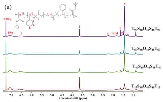 Gel permeation chromatograph (GPC, Waters 1515 system, Waters Corp., Milford, MA, USA) was used to measure the dispersities (Mw/Mns) of TxS48O46S48Tx pentablock terpolymers with polystyrene as the calibration standard and THF as the eluent (1.0 mL/min) at 40 °C. Number-average molecular weights (Mns) of TxS48O46S48Tx and AxS48O46S48Ax were determined from their 1H NMR spectra, which were recorded on a Bruker DMX-400 MHz instrument (Bruker Corp., Karlsruhe, Germany).