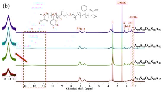 1H NMR spectra of (a) TxS48O46S48Tx (x = 15, 40, 60, 90) in CDCl3 and (b) AxS48O46S48Ax (x = 15, 40, 60, 90) in DMSO-d6.