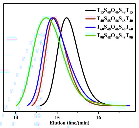 GPC traces of TxS48O46S48Tx (x = 15, 40, 60, 90) pentablock terpolymers.