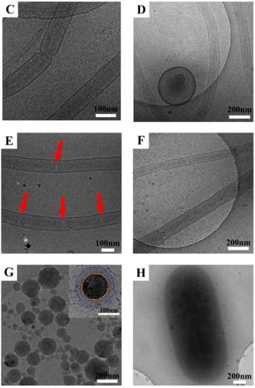 - Won, Y.Y.; Brannan, A.K.; Davis, H.T.; Bates, F.S. Cryogenic Transmission Electron Microscopy (Cryo-TEM) of Micelles and Vesicles Formed in Water by Poly(ethylene oxide)-Based Block Copolymers. J. Phys. Chem. B 2002, 106, 3354–3364. [Google Scholar] [CrossRef]