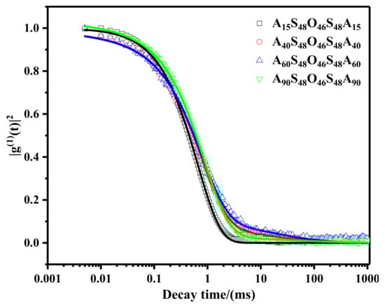 Normalized electric field autocorrelation function g(1)(t) of AxS48O46S48Ax micelles (x = 15, 40, 60, 90) in dilute aqueous solutions measured by DLS at 25 °C and scattering angle θ of 90°. The solid lines well fit with Equation (2) with R2 ≥ 0.999.