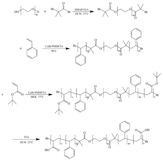 Tert-Butyl acrylate (tBA, 99%), 2-bromoisobutyryl bromide (BIBB, 98%), N,N,N′,N″,N″-pentamethyldiethylenetriamine (PMDETA, 98%), copper(I) bromide (CuBr, 98%), trifluoroacetic acid (TFA, 99.5%), 4-dimethylaminopyridine (DMAP, 98%), and triethylamine (TEA, ultra-dry) were purchased from J&K Chemical Ltd., Shanghai, China. Styrene (St, 99%) and poly(ethylene oxide) (HO-PEO46-OH, Mn = 2050, Mw/Mn = 1.06) were purchased from Sinopharm Chemical Reagent Co., Ltd., Shanghai, China, and Sigma-Aldrich Chemical Ltd., St. Louis, MO, USA, respectively. St and tBA were purified by passing through alkaline alumina column (200–300 mesh), respectively. CuBr was purified by sequential washing with glacial acetic acid, absolute ethanol, and anhydrous ether, followed by drying in a vacuum overnight. The purified CuBr was sealed in a brown bottle for further usage. Other chemicals and solvents with analytical grade were used as received.