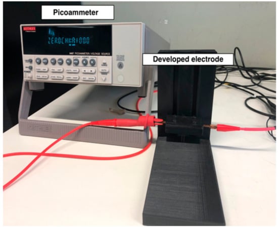 Electrical conductivity measurements were made using a Keitley 487 Picoammeter/Voltage Source by applying a potential difference between −1 to 1 V with a step of 0.1 V at room temperature. In order to be able to measure electrical resistance values, an electrode system with an electrode area of (5 × 1 mm2) and a distance between electrodes of 3 mm was developed. The electrical resistance was determined by the slope of the I–V curves, where Equation (2) was applied to obtain the electrical resistivity and then Equation (3), thus obtaining the electrical conductivity values.