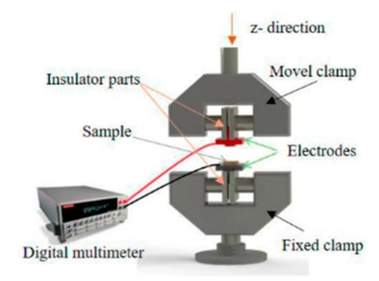 For the piezoresistive tests, two separate devices were used simultaneously: a Shimadzu-AG-IS universal testing machine with a 1000 N load cell, with a Z-axis deformation of 0.5 mm and a compression speed of 4 mm min−1 in the sample with a diameter of 10 mm during 10 cycles. To measure the variation of electrical resistance, two electrodes were placed in the clamps, as can be observed in the diagram of Figure 2. Through these electrodes connected to a Keithley 2700 digital multimeter, it was possible to record the electrical resistance variation over 10 compression cycles.