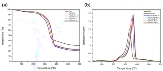 TGA (a) and DTG (b) curves of Flax, FlaxCPG and FlaxCPG with different percentages of GNPs.