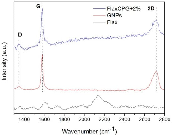 Raman spectra of the flax fabric (black), GNPs powder (red) and the developed FlaxCPG + 2% sample (blue).
