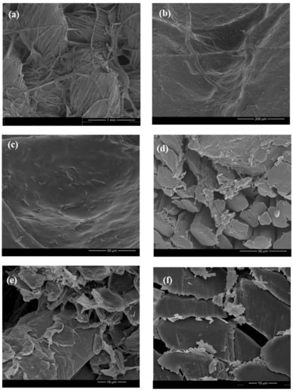 The FESEM technique was used to infer about the distribution of the GNPs onto the ecocomposites as well as to analyze the surface coating based on the polymeric matrices under use. Images from the ecocomposites’ surface (Figure 6a–c) and samples’ cross section (Figure 6c–e) were obtained with different magnifications taking as example the sample with 2% of GNPs.