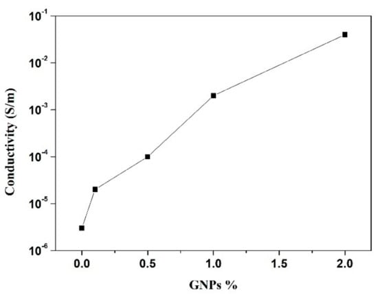 As shown in Table 2 and Figure 7, the introduction of GNPs increased the values of electrical conductivity, proving the electrical properties of these NPs and validating what is reported in several studies about their excellent electrical conductivity [,].