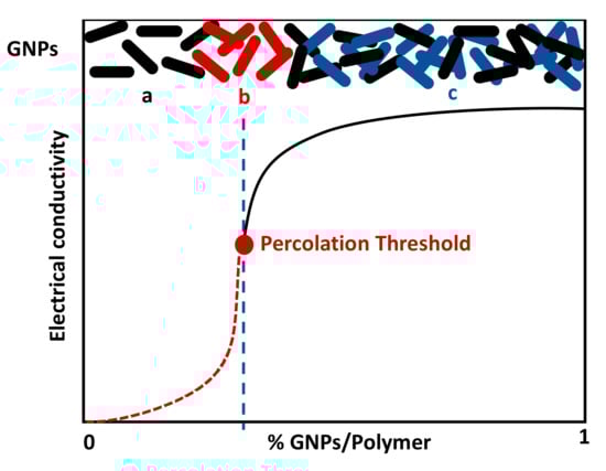 For small percentages (below 0.5% GNPs), the values of electrical conductivity are very low; however, with 2%, the value reaches 0.04 S m−1. In the literature, the percolation threshold theory is presented as the range where the electrical conductivity of the samples varies by some orders of magnitude within this limit and where there is a very small variation in conductivity before and after that limit []. In Figure 8, the percolation threshold is represented, and it is observed that the variation in the conductivity of GNPs/polymer composites can be divided into three phases.