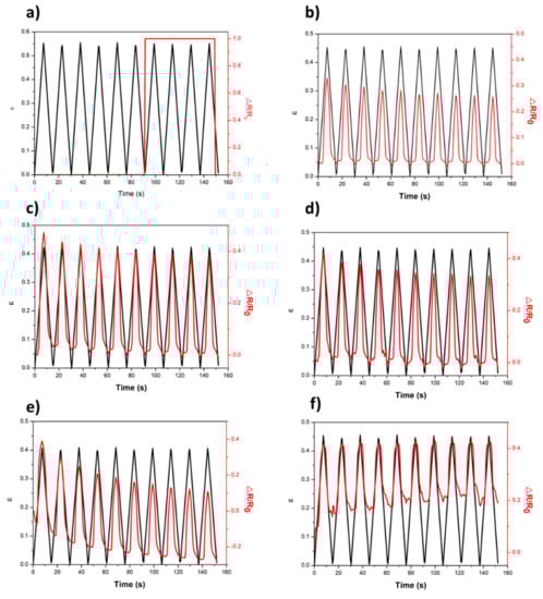 Firstly, only the fabric was analyzed and, as expected, no piezoresistive behavior was observed (Figure 9a). The change in electrical resistance values presented at approximately 90 s is related with fabric “fatigue” that does not recover to its initial shape over the several applied cycles. The pressure applied over several cycles induces the separation between the fibers of the fabric, creating empty spaces between them. Thus, the electrodes come into contact short circuited presenting electrical resistance values that are not real. In all of the other cases (from b to f), the electrical resistance changes with the applied strain, and this tendency is maintained for the 10 cycles, for FlaxCPG samples with different percentages of GNP (0.1 to 2%).