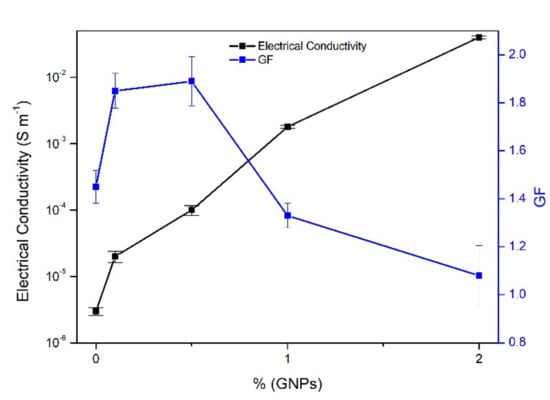 From Figure 10, for percentages between 0.1 and 0.5% of GNPs, there is an increase in both properties, conductivity, and GF. From the percentage of 0.5% of the GNPs and up to 2% of the GNPs, the trend is the decrease of GF and the increase of the electrical conductivity, so the higher the value of the electrical conductivity, the lower the value of GF. According to these results, the percentages between 0.5 and 1% of GNPs (with higher GF) are the best systems to be used as piezoresistive elements in sensors’ applications.