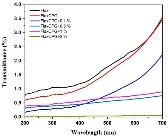 The samples with GNPs presented very low transmittance percentages, especially between 200 and 400 nm. These results imply that the addition of a GNPs’ coating to the flax fabrics can effectively enhance the UV protection of this material.