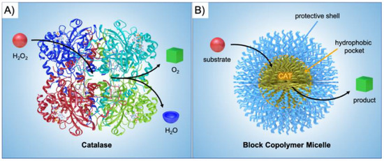 Catalysts have become indispensable components in almost every branch of synthetic chemistry and industry, as they alleviate reaction conditions, can steer reaction paths, and enhance product selectivity [1]. Since catalysis is without a doubt a key technology that is essential to tackle current global challenges (e.g., mobile energy, pharmaceuticals, clean water and air), it is not surprising that a major part of scientific research is devoted to developing more potent catalyst systems. Nature has already developed a multitude of biological nanoreactors (e.g., enzymes, organelles) that are able to synthesize complex organic compounds through highly sophisticated catalytic reaction cycles [2]. Biological nanoreactors are self-assembled or self-organized from structural elements that are equipped with functionalities to fulfill catalytic tasks within the final nanostructure. As a prime example, enzymes display extraordinary catalytic abilities with turn over frequencies (TOFs) unmatched by synthetic catalysts in most cases. Catalase, for instance, is an immensely potent catalyst able to convert H2O2 into O2 and H2O [3] as fast as the substrate can reach the reactive center leading to reaction rates close to the diffusion limit (Figure 1A). A common scheme for biological nanoreactors is the incorporation of catalysts in pockets to protect the active site from cross-reactions or harmful reagents, and to channel the substrate towards the catalyst and products away from it. Inspired by these properties, chemists and materials scientists have invested immense efforts to create building blocks for self-assembled nanostructures with advanced functionality and precise composition [4,5,6,7,8,9,10]. Synthetic chemistry has access to a broad range of materials properties to mimic biological nanoreactors on a basic level, but also to devise entirely new systems that are more robust, responsive, and tailored to application needs [11,12,13,14,15]. The basic idea remains the same: design nanoreactors that safely store the catalytic center within a compartment, while allowing substrates to enter and participate in the reaction (Figure 1B).