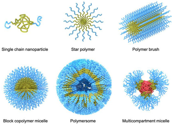 Over the years, a large variety of compartmentalized nanomaterials have been developed for catalysis. Polymer chemistry has access to a diverse toolbox of synthetic methods for the formation of polymer nanostructures. With the advancement of controlled/”living” polymerization techniques [20] including ionic polymerization, reversible addition-fragmentation chain transfer (RAFT) polymerization, atom transfer radical polymerization (ATRP), nitroxide-mediated polymerization (NMP), and ring-opening anionic, cationic, and metathesis polymerization (AROP, CROP, and ROMP), complex polymer architectures become more and more accessible (Figure 2). Aside from the established synthesis of amphiphilic block copolymer (BCPs) that are useful for self-assembly into BCP micelles, polymersomes [14], and multicompartment micelles [21], the synthesis of molecular polymer nanoparticles, such as star polymers [22] and cylindrical polymer brushes [23], has also become more state-of-the-art. Recently, molecular engineering along the polymer chain provided supramolecular binding sites to induce intramolecular chain segment association into single chain polymer nanoparticles [24]. In this review, we will highlight some examples for each of these polymer nanostructures, where one or more catalysts are hosted and employed in diverse reactions. There are of course a range of other polymer scaffolds that have demonstrated high potential in catalytic reactions, e.g., dendrimers [25], microbeads (resins or cross-linked microparticles, microgels) [26,27], and metal-organic frameworks [28]. Throughout this review, we will, however, focus on polymer nanostructures synthesized mainly with controlled polymerization techniques (with few intriguing exceptions).