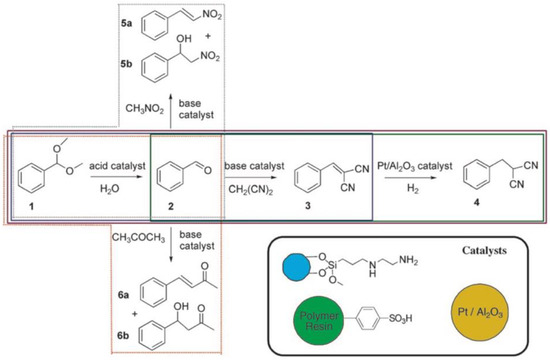 Multistep cascade reaction mediated by a combination of three different supported catalysts in a one-pot reaction. Each colored box shows a different reaction path. Reproduced with permission of [50]. Copyright 2006 Wiley-VCH.