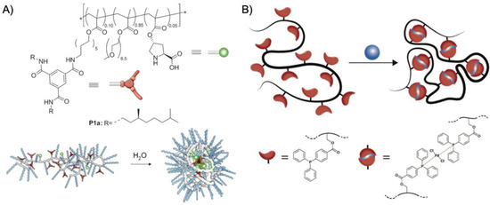 Example for single chain polymer nanoparticles (SCPN) catalysis. (A) SCPN with L-proline for the enantioselective aldol reaction of cyclohexanone and p-nitrobenzaldehyde. (B) Selective point folding of SCPNs promoted by triphenylphospane coordination with dichloro(1,5-cyclooctadiene)palladium. (A) reproduced with permission of [58]. Copyright 2013 Wiley-VCH. (B) reproduced with permission of [63]. Copyright 2015 Royal Society of Chemistry.