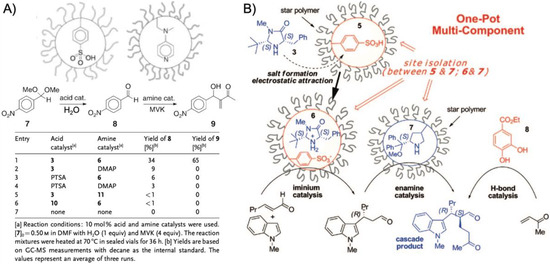 One benefit of higher arm numbers is that the cores of star polymers do not interpenetrate each other due to steric repulsion of the brush-like shell. It was therefore possible to separately store incompatible catalysts in different cores and mix star polymers without catalyst deactivation. This was demonstrated on two starpolymers containing an acid and a base catalyst in the cores to perform cascade reactions (Figure 5A) [78]. Both star polymers were prepared by NMP of linear PS or PNIPAAm homopolymers followed by copolymerization of styrene and DVB with either phenyl 4-vinylbenzenesulfonate (PVBS) or 4-N-(4-vinylbenzyl)oxyethyl-N-methylaminopyridine (VEMAP). VEMAP is a derivate of the base catalyst, 4-dimethylaminopyridine (DMAP), whereas thermal deprotection of PVBS to polystyrene sulfonic acid (PSSA) resulted in the acid catalyst resembling p-toluenesulfonic acid (PTSA). Mixing both star polymers in DMF allowed the one-pot acid-catalyzed hydrolysis of 4-nitrobenzaldehyde dimethyl acetal followed by the base-catalyzed Baylis–Hillman reaction of 4-nitrobenzaldehyde with methyl vinyl ketone (MVK) with 65% yield of the final product after 36 h (Figure 5A). The same cascade reaction could not be achieved using unsupported DMAP or PTSA or linear copolymers as catalysts. Addition of either DMAP or PTSA to the star polymers quenched the complimentary catalyst, as small molecules were able to diffuse into the cross-linked core network (much like the substrates). This proved the benefit of site isolation of catalysts in star-polymers. In a subsequent work, this acid/base system was developed further by replacing VEMAP with an L-proline catalyst for asymmetric acid-base cascade catalysis (Figure 5B) [79]. A MacMillan imidazolidinone organocatalyst was added able to diffuse into the PSSA core to form an iminium ion catalyst bound by electrostatic attraction. The catalyst system enabled the multistep one-pot reaction involving the nucleophilic addition of 2-hexenal to N-methyl indole (iminium catalysis) followed by the L-proline-catalyzed Michael addition of MVK (enamine catalysis) to the final cascade product with 80% yield and with >99% ee in 48 h (89% yield with H-bonding co-catalyst). The reaction proceeded in organic solvents at −30 °C to −40 °C followed by heating to rt. Stereoselectivity for the product could be fully controlled by variation of catalyst chirality. Formation of the cascade product could barely be observed when star polymers were replaced with linear polymer analogues or unsupported catalysts, which again confirmed the protection of catalysts by the star core that prevented their mutual deactivation.
