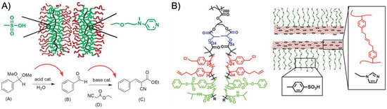 Cylindrical polymer brushes can be seen as the 1D extension of star polymers with essentially the same tailoring capabilities for core and shell [23]. Core-shell brushes have been extensively researched as containers for the growth of inorganic nanocrystals [82]. The utility of core-confined bottlebrush copolymers for catalysis was demonstrated for the site isolation of PSSA and VEMPA catalysts to perform a one-pot acid-base cascade reaction (Figure 6A) [83]. RAFT polymerization of GMA afforded polymer backbones with Mw/Mn < 1.1 and overall length of 140 units. After hydrolysis of the pendent epoxides and esterification with CTAs (ca. 63% modification), the core-shell brush was grafted from the backbone also by RAFT copolymerization of PVBS (or VEMAP) and 4-(3-butenyl)styrene (BS), and PNIPAAm as a stabilizing outer shell. The BS comonomer is a clever choice as cross-linker, because only the vinyl bond participates in the RAFT polymerization. The 3-butenyl double bond could later be cross-linked in a metathesis reaction. The anisotropic but relatively short bottlebrushes catalyzed the hydrolysis of benzaldehyde dimethyl acetal followed by a Knoevenagel reaction with ethyl 2-cyanoacetate resulting in 87% yield of the cascade product. The reaction was performed in DMSO/H2O (40:1) at 70 °C for 48 h (Figure 6A). Control experiments showed that non-cross-linked bottlebrushes or unsupported catalysts led to mutual quenching and no cascade product was formed. To reduce the diffusion path of the reactants between both bottlebrush nanoreactors, a new nanoreactor was designed containing both acid and base catalysts site-isolated within a hollow core-shell-corona brush (Figure 6B) [84]. In this case, ABC triblock terpolymer arms were grafted from the PGMA backbone, starting with lactic acid (LA) via AROP to create the sacrificial core. PLA was capped with a CTA to polymerize the VBC/BS shell and the VBS/NIPAAm corona. The final PGMA-g-PLA-g-P(VBC-co-BS)-g-P(VBS-co-NIPAAm) brush precursor was then transformed into nanotubes by cross-linking the BS units, hydrolysis of PVBS to PSSA, modification of VBC to azide, and click-attachment of 1-(2-(prop-2-yn-1-yloxy)ethyl)-1H-imidazole (PEI) as base catalyst. The organic nanotubes then featured a site-isolated sulfonic acid catalyst in the corona and an imidazole base catalyst in the cross-linked shell. The cascade nanoreactor successfully converted benzaldehyde dimethyl acetal into ethyl trans-α-cyano-cinnamate with > 99% yield in water at rt after 24 h.