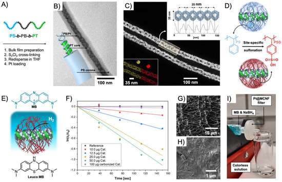 Polystyrene-block-polybutadiene-block-poly(tert-butyl methacrylate) (PS-b-PB-b-PT) template for organic/inorganic Pt hybrids. (A) Nanostructure fabrication process. (B) TEM of multicompartment nanofiber with Pt double helix and PS corona. (C) STEM of Pt double helix, grey scale analysis of the marked areas, and EDX analysis (yellow: S; red: Pt). (D) Scheme of PS sulfonation to PSS. (E) Scheme of the catalytic degradation of MB to Leuco MB. (F) Ln(ct/c0) vs. time without catalyst (black), ccat = 10 mg·L−1 (red), 12.5 mg·L−1 (blue), 25 mg·L−1 (yellow), and 50 mg·L−1 (green); reference sample Pt/C at 100 mg·L−1 (purple). Initial concentrations are: [MB] = 2.0 × 10−5 м, [NaBH4] = 2.0 × 10−2 м. (G) SEM image of 0.45 µm PTFE syringe filter and Pt@MCNFs-coated filter surface (H). (I) Flow set-up to catalyze MB in water using modified syringe filter at a flow rate of 1 mL·h−1. Adapted with permission of [93]. Copyright 2020 American Chemical Society.