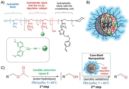 More recently, the aerobic oxidation of primary alcohols was realized with bipyridine-functionalized PAOx BCPs [112]. The bipyridine (bpy) ligand was incorporated either as oxazoline comonomer or via polymer-analogue reaction to the precursor polymer to create a library of BCPs with different compositions. The catalytic activity of the micelles was studied on a co-catalyst system of Cu(I)Br and 2,2,6,6-tetramethyl-1-piperidine-N-oxyl (TEMPO). The micellar (bpy)Cu(I)/nitroxyl co-catalyst system with varying compositions and alkyl spacers performed the aerobic oxidation of primary alcohols, e.g., benzyl alcohol to benzaldehyde, in water with conversions > 99% in 3 h under air at rt (1-methylimidazole (NMI) was added as base). Unlike previous examples, one remarkable feature of this polymer support system was that extraction enabled separation of products and catalysts with no significant decrease in catalytic reactivity even after five cycles. The core-shell structure of BCP micelles also allows the separate storage of two catalysts, e.g., in core and corona (or core and continuous phase). The oxidation of benzyl alcohol to benzaldehyde in water was demonstrated on a library of amphiphilic star BCPs [113]. They were synthesized with a NMP initiator-modified tris(benzyltriazolylmethyl) amine (TBTA), off which first pentafluorostyrene (PFS), 2,2,3,3,4,4,4-heptafluorobutyl acrylate (PFBA) or 1H,1H,2H,2H-perfluorodecyl acrylate (PFDA) was polymerized to form a hydrophobic core followed by a hydrophilic p-oligo(ethylene glycol) styrene (OEGSt) or OEGMA shell. Molecular weights were kept below Mn < 15 kg·mol−1 with Mw/Mn < 1.3. According to DLS, the Rh were larger than 10 nm, reaching even 60 nm in some cases, suggesting that the star-BCPs did not form molecular polymer nanoparticles as described in Section 3, but they self-assembled into micelles and vesicles as verified by AFM and TEM. The CuSO4/TEMPO systems catalyzed the oxidation of benzyl alcohol to benzaldehyde in combination with DMAP as co-catalyst in water at rt. From a variety of systems, the highest conversion of 90% was obtained with 1.56 wt.% of the (PFBA14-b-OEGMA30)3 scaffold, 2 mol% CuSO4, 2.5 mol% TEMPO, and a rather excessive amount of 50 mol% DMAP (all relative to benzyl alcohol). Nevertheless, removing the nanoreactor led to almost no conversion under the same reaction conditions. The same oxidation reaction was investigated for TEMPO-modified micelles synthesized by ROMP-induced self-assembly (ROMPISA) [114,115]. First, a linear copolymer of norbornene derivates with TEMPO and OEGMA was prepared in THF at rt using a Grubs catalyst. Block extension with norbornene in EtOH/THF induced the PISA of micelles with tunable diameters between 10–160 nm (depending on Mn = 11–250 kg·mol−1). The entire synthetic process to catalytic NPs was completed within only few minutes underlining the feasibility for upscaling. For the TEMPO-catalyzed Aneli’s oxidation of alcohols, NaOCl, KBr, and NaHCO3 were added to regenerate TEMPO, thereby providing a transition-metal-free catalysis route to alcohol oxidation [116]. The oxidation proceeded with 10 mol% NPs in water (pH 8.6) at 0 °C and reached conversions > 98% after only 1 h. The recyclable nanoparticles displayed similar oxidation rates for isopropanol as previously reported for a molecular TEMPO catalyst in biphasic systems [117]. An interesting alternative application was presented by employing the TEMPO-modified NPs as antioxidants that scavenge reactive oxygen species produced from H2O2 and HRP, which could be useful in MRI applications. Building on the (bpy)Cu(I)/nitroxyl system discussed for Ref. [112], CalB enzymes were added as incompatible catalysts to perform a chemoenzymatic one-pot cascade reaction in water [118]. Catalytic core cross-linked nanoparticles were prepared from a PAOx-based ABC triblock terpolymer composed of a PMeOx corona, a hydrophobic shell containing the (bpy)Cu(I)/nitroxyl catalyst, and a cross-linkable hydrophobic core (Figure 9A). A microemulsion procedure first created core-shell-corona micelles with Rh~15 nm that were cross-linked with hexanediol dimethacrylate (HDDMA) and AIBN. The (bpy)Cu(I)/nitroxyl carrying nanoparticles (Figure 9B) efficiently catalyzed the oxidation of a range of primary alcohols with >95% conversion and >95% yield. The addition of CalB enzymes immobilized in commercially available polyacrylate beads did not lead to mutual deactivation, and the catalyst mixture was able to perform a multistep one-pot reaction in the PBS buffer solution. Acetylated versions of the primary alcohols were first deacetylated into allylic or benzylic alcohols with >99% conversion by enzymatic ester hydrolysis at 40 °C, followed by oxidation of the alcohol to the corresponding aldehyde by the (bpy)Cu(I)/nitroxyl catalyst with the above-mentioned yields (Figure 9C).