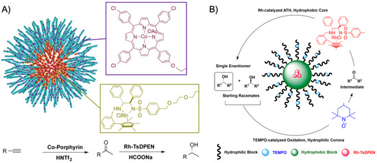 Site isolation of two incompatible catalysts in core and shell of ABC triblock terpolymer core-shell corona micelles. (A) Alkyne hydrogenation and asymmetric transfer hydrogenation to chiral alcohols. (B) TEMPO-catalyzed oxidation of racemic to ketones and Rh-catalyzed asymmetric transfer hydrogenation. Adapted with permission of [120] and [121]. Copyright 2015 and 2019 American Chemical Society.