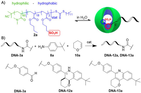 BCP micelles with strong acid organocatalyst were recently reported to catalyze a large library of DNA-conjugation reactions under mild conditions, i.e., without damaging the DNA itself (e.g., cleavage of purine bases) [124]. The BCP was prepared by sequential RAFT polymerization of hydrophilic N,N-dimethylacrylamide (DMA) and a statistical copolymer of hydrophobic nBA and 3-sulfopropyl acrylate (Figure 11A). The self-assembled spherical micelles in water had a Rh = 10 nm with the Brønsted acid located in the hydrophobic core. The micellar catalyst was employed in the multicomponent Povarov reaction able to convert a variety of 14mer DNA-aldehydes with p-tert-butyl-aniline and 3,4-dihydro-2H-pyran to a substituted tetrahydrochinolines in a Diels-Alder reaction (Figure 11B). Quantitative conversion was reached after 6 h at 40 °C, after 4 h at 50 °C, and after 2 h at 60 °C.