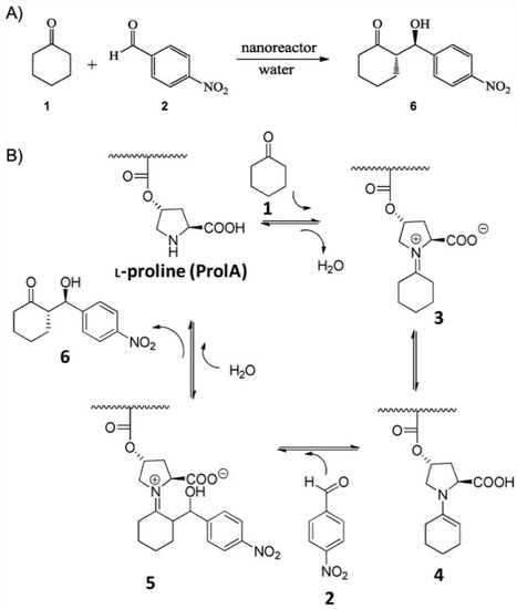 If the organocatalyst inherits a stereocenter, enantioselective catalysis becomes viable also in polymer compartments, as exemplified on L-proline-catalyzed aldol reactions [125]. A frequently reported model reaction is the L-proline-catalyzed aldol reaction of cyclohexanone and 4-nitrobenzaldehyde to give the stereo- and enantioselective aldol product (Figure 12A). The mechanism involves the following steps (Figure 12B): the nucleophilic attack of the amine of L-proline to cyclohexanone (1) and dehydration of the intermediate to the iminium ion (3); deprotonation into the enamine (4) initiates C-C bond formation with p-nitrobenzaldehyde (2) to give the iminium-aldol intermediate (5) that is hydrolyzed to the final enantiomeric aldol product (6) while replenishing the L-proline catalyst. This reaction will be relevant in the following for several nanoreactors.
