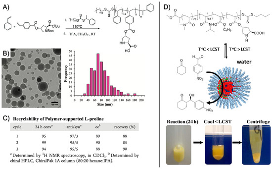 So far, several strategies have been reported to incorporate derivates of L-proline base catalysts into BCPs, often by synthesizing a Boc-protected L-proline monomer or by post-modification of preformed polymers with functional L-prolines [126,127,128,129,130,131]. For instance, the protected 4-vinylbenzoic acid tert-butyl/Boc-L-proline ester was synthesized by esterification of 4-vinyl benzoic acid with tert-butyl/Boc- 4-hydroxy-L-proline [127]. RAFT polymerization with styrene in bulk at 110 °C produced copolymers with narrow Mw/Mn < 1.10 and a L-proline content of about 5 mol% (reflecting the monomer feed) (Figure 13A). The statistical copolymer formed micelles in DMF with low vol% of water with relatively broad size distribution attributed to a monomer gradient along the chain, where higher L-proline contents increased the polarity and were theorized to serve as the stabilizing part (Figure 13B). At high catalyst loadings (10 mol% and 20 mol%), both the micelle catalyst and unsupported L-proline efficiently catalyzed the aldol reaction (Figure 12A) reaching conversions of > 90% with > 85% ee in DMF after 24 h containing 5 vol% water. At low catalyst loading of 1 mol%, the micelle catalyst reached much higher conversion (57%) as compared to the unsupported L-proline (12%). When the reaction was carried out without any addition of water, the micelle catalyst still delivered 49% conversion with 91% ee compared to 21% conversion with 83% ee of the anti-product. According to DLS, polymers were molecularly dissolved in DMF but chains were contracted with a Rh of only 1.5 nm reminiscent of SCPNs. Addition of 5 vol% water initiated the aggregation into larger structures with Rh = 80 nm. Judging from the size in TEM, the larger structures could be either assigned to large compound micelles or possibly polymer-rich droplets stabilized by the polymeric surfactant. The micelle catalyst could be recycled and reused without loss of activity or selectivity (Figure 13C). The copolymer design was not ideal for micelle formation as it did depend on the unknown copolymer composition along the chain. A clearer separation of corona and core was realized by RAFT polymerization of an amphiphilic PDMA-b-poly(NIPAAm-co-BA-co-O-acryloyl-trans-4-hydroxy-L-proline) BCP (Figure 13D) [126].