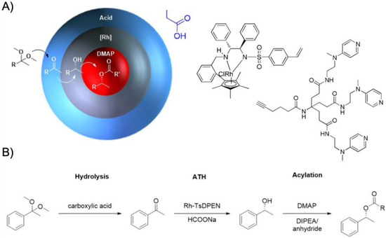 Core-shell-corona micelles with a cross-linked shell inheriting three incompatible catalysts. (A) Poly(2-oxazoline)-based core-shell-corona morphology with acid, base, and metal catalyst isolated in corona, core, and shell respectively. (B) Three-step reaction for hydrolysis-hydrogenation-acylation cascades of ketals to enantiomeric esters. Adapted and reproduced with permission of [133]. Copyright 2018 Wiley-VCH.