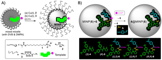 A completely different approach to asymmetric catalysis involved the imprinting of cross-linkable micelle cores with chiral pockets providing recognition sites for the substrate in an analogy to the lock and key principle of enzymes. Molecularly imprinted nanoparticles (MINPs) were realized by co-assembly of a tripropargylammonuiumbromide dodecyl methacrylate surfactant together with the substrate as template (Figure 15A) [134]. Free radical polymerization of DVB with the photoinitiator 2,2-dimethoxy-2-phenylacetophenone cross-linked the micelles core, while the propargyl moieties were cross-linked on the surface with diazides, thereby solidifying the entire nanoparticle. For the L-proline-catalyzed aldol reaction of acetone with various benzaldehydes, chiral microenvironments were fabricate by peptide chemistry using (S)-prolinamide (green in Figure 15B) as the active site and (S)-p-nitrophenylalanine (cyan in Figure 15B) to facilitate chiral gating of catalyst and substrates (S,S template) [135]. The (S)-prolinamide catalyst and non-imprinted nanoparticles only showed minor activity in water. Addition of increasing amounts of MINPs to a solution containing (S)-prolinamide enhanced conversion and enantioselectivity in water peaking at 99% conversion (96% ee) for 15 mol% MINPs and 10 mol% (S)-prolinamide catalyst. The MINPs were able to safely store the catalyst in the hydrophobic core pockets where it could perform the catalytic reaction. The nanopockets showed high selectively towards the proper catalyst enantiomer with binding constants of 20.4 × 104 M−1 for (S)-proline and 0.18 × 104 M−1 (R)-proline. Similarly, the nanopocket was selective to the benzaldehyde derivate as increasingly bulky substituents led to lower conversions, e.g., p-chlorobenzaldehyde with similar size gave 95% (98% ee), whereas o-nitrobenzaldehyde yielded 28% (65% ee), and naphthaldehyde only 11% (0% ee). By changing the template to naphthaldehyde instead of p-nitrobenzaldehyde, naphthaldehyde was catalyzed with 87% conversion (97% ee), underlining the potential of the template to accommodate the proper substrate.