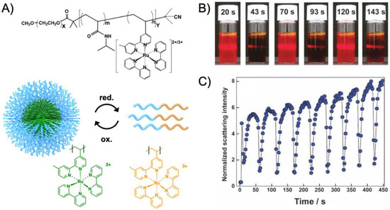 Self-oscillating micelles. (A) PEO-b-P(NIPAAm-r-Ru(bpy)3) BCP and redox-responsive assembly/disassembly depending on the oxidative state of Ru(bpy)3. (B) Time-dependent scattering of the BCP solution synchronized to a BZ reaction. (C) Recorded scattering intensity over time showing oscillating formation/dissipation of BCP micelles. Adapted with permission of [136]. Copyright 2013 Royal Society of Chemistry.