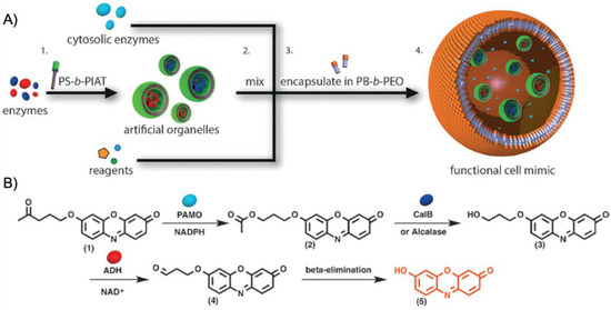 Instead of confining one catalyst into one container, loading of two polymersomes with different enzymes can be an alternative strategy for one-pot tandem reactions in water [147]. PS-block-poly(isocyanoalanine(2-thiophen-3-yl-ethyl)amide) (PS-b-PIAT) polymersomes with permeable membranes were prepared by injecting a BCP/THF solution (1 mg·mL−1) into water containing either GOx or HRP. After mixing both polymersomes, the addition of glucose and ABTS substrates led to the oxidation of glucose to gluconolactone by the GOx enzyme accompanied by the producing of H2O2 that, in a second step, was consumed by HRP for the oxidation of ABTS to ABTS+. In a preceding work, both enzymes were enclosed in the same PS-b-PIAT polymersome, while a third enzyme was located in the continuous phase. HRP resided in the porous membrane, GOx in the lumen and Candida Antarctica Lipase B (CalB) was kept outside the polymersome [148]. The substrate 1,2,3,4-tetra-O-acetyl-b-glucopyranose was deacetylated to glucose by CalB, converted to its lactone by GOx, and the produced H2O2 aided in the conversion of ABTS to ABTS+ by HRP. To go one step further, the porous nature of the PS-b-PIAT membrane was also exploited for the separate encapsulation of the CalB and alcohol dehydrogenase (ADH) [149]. The enzyme-loaded PS-b-PIAT polymersomes were in turn encapsulated by giant PEO-b-PB vesicles together with a third enzyme, phenyl acetone monooxygenase (PAMO) (Figure 18A). These giant polymersome-in-polymersome systems serve as cell mimics capable to exchange reactants between encapsulated polymersomes and to perform a 4-step cascade reaction to produce a fluorescent product (Figure 18B). The profluorescent substrate 7-((4-oxopentyl)oxy)-3H-phenoxazin-3-one undergoes a Bayer-Villiger oxidation catalyzed by PAMO with NADPH as cofactor to form an ester, which is subsequently converted by CalB to a primary alcohol. Oxidation of the alcohol catalyzed by ADH takes places in the presence of NAD+ to form an aldehyde that is ultimately converted to the fluorescent product, 7-hydroxy-3H-phenoxazin-3-one, after spontaneous beta-elimination. This example impressively demonstrated the complexity that can be achieved with comparably simple BCP scaffolds given that both preparation and reactants are carefully chosen.