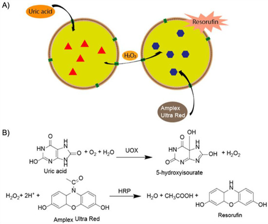 An enzymatic cascade system for the detoxification of complex media from uric acid was realized by the encapsulation of two different biocatalysts in ABA triblock copolymer polymersomes [150]. Polymersomes of PMeOx-b-PDMS-b-PMeOx were formed via film rehydration in the presence of either fungal uricase (UOX) or HRP (Figure 19A). This non-native combination of enzymes aided in the simultaneous consumption of uric acid and H2O2, which are associated with pathologic conditions such as gout and oxidative stress. Nanocompartments containing the UOX enzyme converted uric acid to 5-hydroxyisourate and H2O2 in the first step. In the second step, H2O2 was catalyzed to acidic water by HRP that converted Amplex red to resorufin (Figure 19B). The cascade reaction with two spatially isolated nanocontainers was evaluated in human blood serum and cells, underlining the bioinspired approach to mimic sequential enzymatic reactions in biological systems.