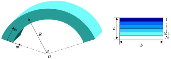 Figure 1 represents a curved nano-size beam made of polymeric nanocomposites which is reinforced with GNPs consisting of Nl layers with thickness Δh = h/Nl. The curved beam also includes the length L, radius of curvature R, opening angle α. Here, a modified rule of mixture in conjunction with the Halpin-Tasi model is adopted to get the effective material properties such as Young modulus, density, and Poisson ratio as below [54,55,56]:
