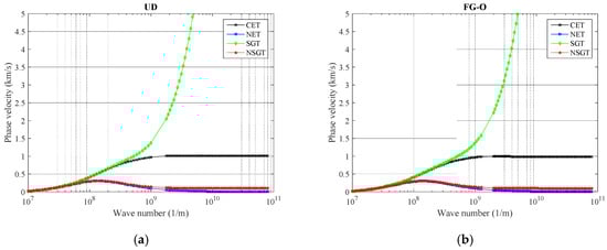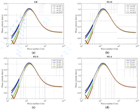 As discussed before, there are different patterns to model the GNPs inside polymer-reinforced nanocomposites. In Figure 3, the phase velocity of graphene reinforced polymeric nanocomposite curved beams made of various GNPs distribution schemes (UD, FX-O, FG-X, and FG-A) are illustrated for multiple opening angle values. For this purpose, the wave number is flexible for 0.01 to 100 (1/nm). As observed, when the wave number increases, the phase velocity curves follow a similar trend independently of the GNP scheme so that the phase velocity is increased to its peak around 1 × 108 (1/m), and then becomes moderate for high wave numbers after a sharp decline. Regarding the role of the opening angle, as it decreases the phase velocity is increased due to the fact that with a higher angle of curvature, the curved nanobeam converts to a softer structure with lower frequencies. However, there is an exception for α = 2π/3 when the wave number is supposed to be very low (1 × 108 (1/m)). To be more precise, the opening angle is a more prominent factor at low wave numbers while for high wave numbers, change in the curvature of the curved nanobeam is not an influential factor in phase velocity variations. Moreover, it can be seen that FG-X properties have the highest wave frequencies; the FG-O behaves oppositely, while the gap between wave responses of UD and FG-A patterns seems to be small.